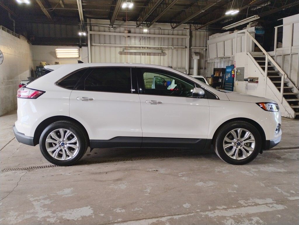 Equipment Group 300A, Ford Co-Pilot360 Assist+ (Adaptive Cruise Control w/Stop & Go, Evasive Steering Assist, Lane Centering, SiriusXM Traffic & Travel Link, and Voice-Activated Touchscreen Navigation System), Edge Titanium, EcoBoost 2.0L I4 GTDi DOHC Turbocharged VCT, AWD, White, Ebony Leather, 12 Speakers, 3.80 Axle Ratio, 4-Wheel Disc Brakes, ABS brakes, Air Conditioning, Alloy wheels, AM/FM radio: SiriusXM, Auto High-beam Headlights, Auto tilt-away steering wheel, Auto-dimming Rear-View mirror, Automatic temperature control, Brake assist, Bumpers: body-color, Compass, Delay-off headlights, Driver door bin, Driver vanity mirror, Dual front impact airbags, Dual front side impact airbags, Electronic Stability Control, Emergency communication system: SYNC 3 911 Assist, FordPass Connect, Four wheel independent suspension, Front anti-roll bar, Front Bucket Seats, Front Center Armrest w/Storage, Front dual zone A/C, Front fog lights, Front reading lights, Fully automatic headlights, Garage door transmitter, Heated door mirrors, Heated front seats, Heated steering wheel, Illuminated entry, Knee airbag, Leather-Trimmed Heated Sport Bucket Seats, Low tire pressure warning, Memory seat, Occupant sensing airbag, Outside temperature display, Overhead airbag, Overhead console, Panic alarm, Panoramic Vista Roof, Passenger door bin, Passenger vanity mirror, Power door mirrors, Power driver seat, Power Liftgate, Power passenger seat, Power steering, Power windows, Radio: B&O Sound System by Bang & Olufsen, Rain sensing wipers, Rear anti-roll bar, Rear reading lights, Rear seat center armrest, Rear window defroster, Rear window wiper, Remote keyless entry, Roof rack: rails only, Security system, SiriusXM Radio, Speed control, Speed-Sensitive Wipers, Split folding rear seat, Spoiler, Steering wheel memory, Steering wheel mounted audio controls, SYNC 3 Communications & Entertainment System, Tachometer, Telescoping steering wheel, Tilt steering wheel, Traction control, Trip computer, Turn signal indicator mirrors, Variably intermittent wipers, and Wheels: 19" Luster Nickel-Painted Aluminum. Edge Titanium, EcoBoost 2.0L I4 GTDi DOHC Turbocharged VCT, AWD, White, Ebony Leather.